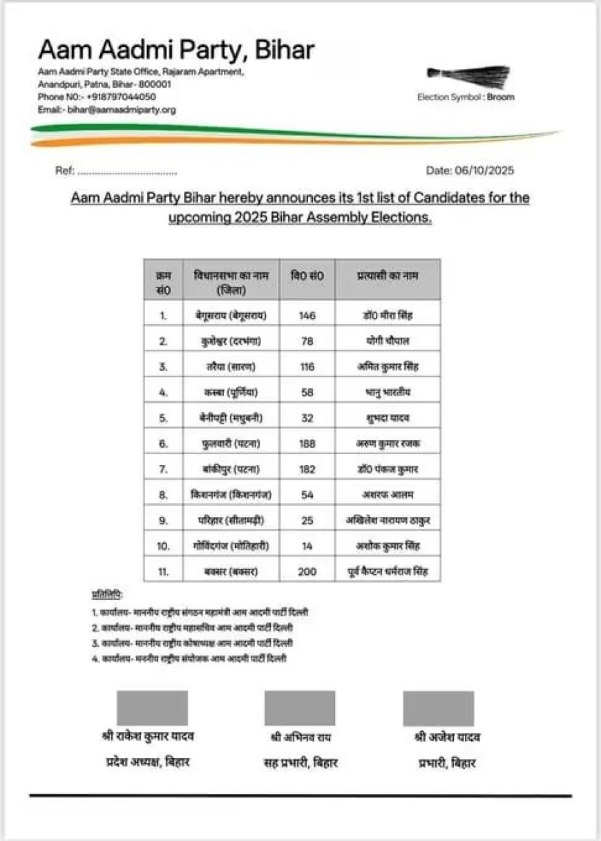 बिहार विधानसभा चुनाव 2025: AAP ने जारी की पहली उम्मीदवार सूची, 11 नाम शामिल