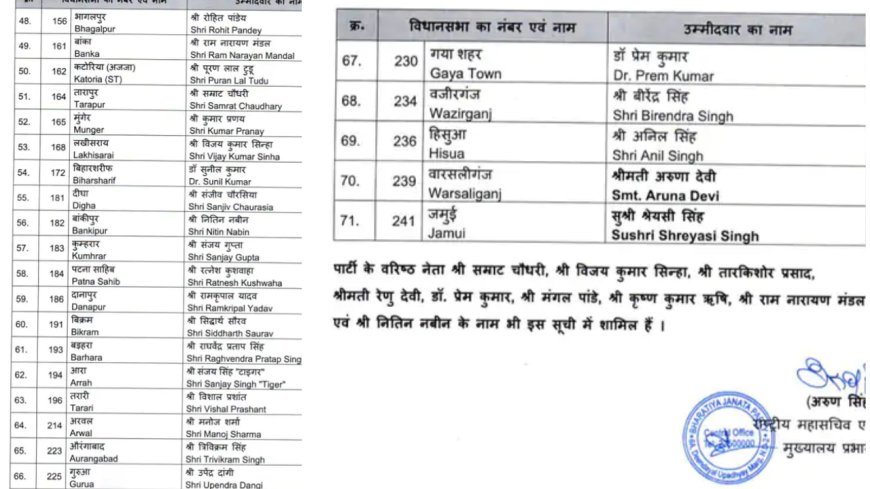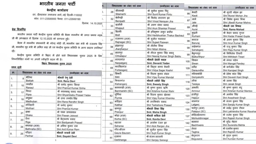 बिहार विधानसभा चुनाव 2025 के लिए भारतीय जनता पार्टी (भाजपा) ने मंगलवार को 71 उम्मीदवारों की पहली सूची जारी कर दी है। इस सूची में दोनों डिप्टी सीएम – सम्राट चौधरी को तारापुर से और विजय सिन्हा को लखीसराय से टिकट दिया गया है।हालांकि पार्टी ने कई दिग्गज नेताओं का टिकट काटकर सभी को चौंका दिया है। विधानसभा अध्यक्ष नंदकिशोर यादव, जो लगातार 5 बार पटना सिटी से चुनाव जीतते आ रहे हैं, इस बार सूची से बाहर हैं। इसी तरह कुम्हरार....