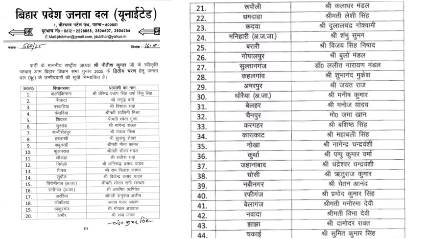 बिहार चुनाव 2025: JDU ने जारी की दूसरी लिस्ट, 9 महिलाएं, 4 मुस्लिम, राजबल्लभ यादव की पत्नी विभा देवी को मिला टिकट