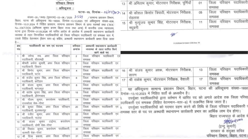 बिहार सरकार के परिवहन विभाग ने प्रशासनिक ढांचे को मजबूत करने की दिशा में एक अहम कदम उठाया है। विभाग ने 17 अधिकारियों को प्रमोशन देते हुए उन्हें जिला परिवहन पदाधिकारी (DTO) के समकक्ष जिम्मेदारी सौंपी है। जारी अधिसूचना के मुताबिक, प्रमोट किए गए अधिकारियों में 12 अपर जिला परिवहन पदाधिकारी (ADTO) और 5 मोटरयान निरीक्षक (MVI) शामिल हैं। सभी को अस्थायी रूप....
