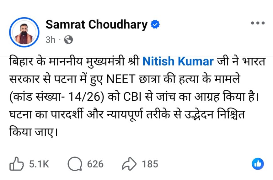 पटना के एक हॉस्टल में जहानाबाद की नीट (NEET) छात्रा की संदिग्ध मौत के मामले ने अब नया और अहम मोड़ ले लिया है। बिहार सरकार ने इस हाई-प्रोफाइल केस की CBI जांच की सिफारिश कर दी है। डिप्टी सीएम और गृह मंत्री सम्राट चौधरी ने बताया कि मुख्यमंत्री नीतीश कुमार ने भारत सरकार से औपचारिक रूप से CBI जांच का अनुरोध किया है।सम्राट चौधरी ने सोशल मीडिया प्लेटफॉर्म पर इसकी जानकारी साझा करते हुए कहा कि मामले की निष्पक्ष और गहन जांच के लिए यह फैसला लिया गया है, ताकि सच्चाई सामने आ सके और पीड़ित परिवार को न्याय मिल सके। उन्होंने लिखा है- "बिहार के माननीय मुख्यमंत्री श्री Nitish Kumar जी ने भारत सरकार से पटना में हुए NEET छात्रा की हत्या के मामले (कांड संख्या- 14/26) को CBI से जांच का आग्रह किया है। घटना का पारदर्शी और न्यायपूर्ण तरीके से उद्भेदन निश्चित किया जाए।"