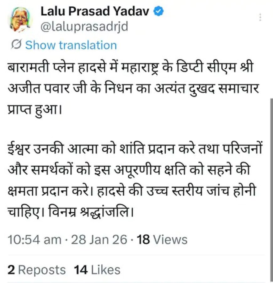 वहीं अजित पवार के प्लेन क्रैश पर लालू प्रसाद ने उच्च स्तरीय जांच की मांग कर दी है। लालू प्रसाद ने लिखा, ‘बारामती प्लेन हादसे में महाराष्ट्र के डिप्टी सीएम अजित पवार जी के निधन का अत्यंत दुखद समाचार प्राप्त हुआ।ईश्वर उनकी आत्मा को शांति प्रदान करे और परिजनों और समर्थकों को इस अपूरणीय क्षति को सहने की क्षमता प्रदान करे। हादसे की उच्च स्तरीय जांच होनी चाहिए। विनम्र श्रद्धांजलि।