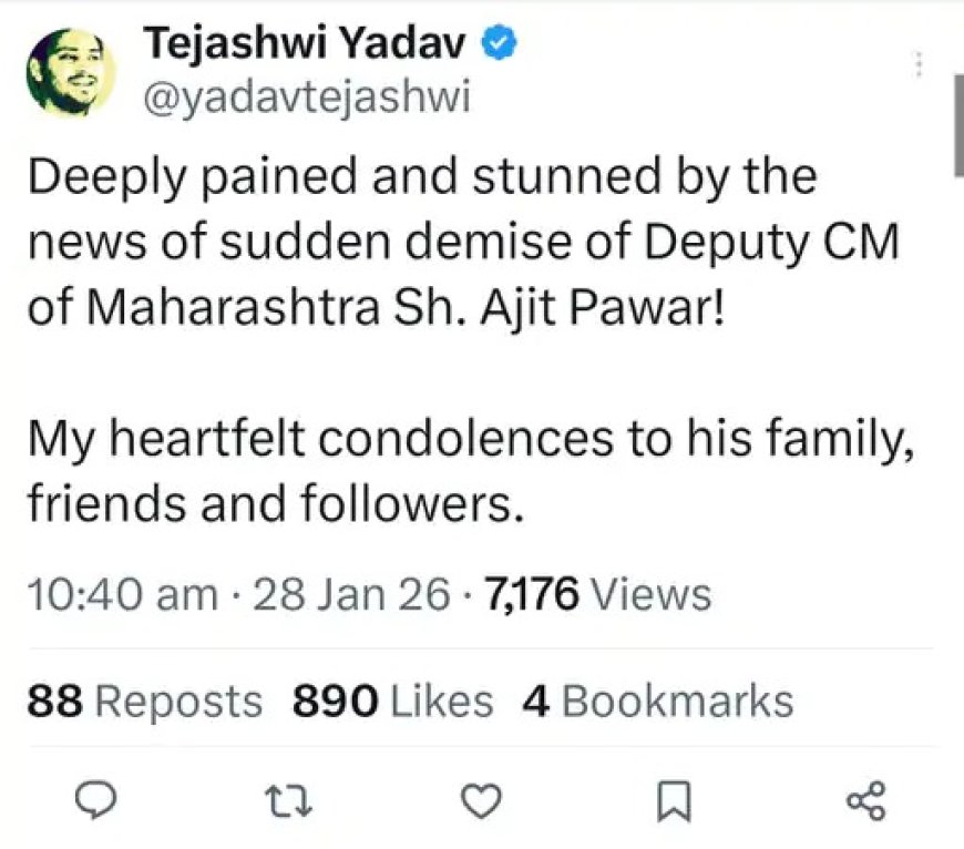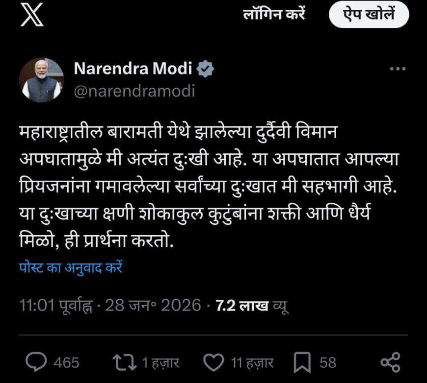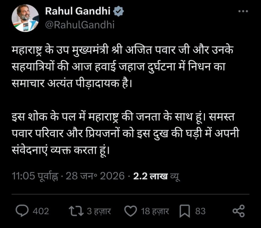 वहीं कांग्रेस नेता राहुल गांधी ने एक्स पोस्ट किया, 'महाराष्ट्र के उप मुख्यमंत्री श्री अजित पवार जी और उनके सहयात्रियों की आज हवाई जहाज दुर्घटना में निधन का समाचार अत्यंत पीड़ादायक है। इस शोक के पल में महाराष्ट्र की जनता के साथ हूं। समस्त पवार परिवार और प्रियजनों को इस दुख की घड़ी में अपनी संवेदनाएं व्यक्त करता हूं।'