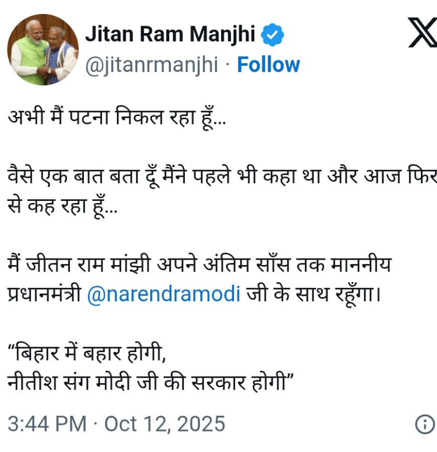 जीतन राम मांझी ने अपने आधिकारिक सोशल मीडिया अकाउंट पर पोस्ट करते हुए लिखा "मैं जीतन राम मांझी, अपने अंतिम सांस तक प्रधानमंत्री नरेंद्र मोदी जी के साथ रहूंगा।"उनका यह बयान ऐसे समय आया है जब एनडीए में सीट बंटवारे को लेकर उनकी पार्टी की नाराजगी की खबरें मीडिया में सुर्खियां बनी हुई थीं। मांझी ने सिर्फ समर्थन का ऐलान ही नहीं किया, बल्कि बिहार की राजनीतिक तस्वीर को स्पष्ट करते हुए एक नया नारा भी दिया "बिहार में बहार होगी, नीतीश संग मोदी जी की सरकार होगी।"