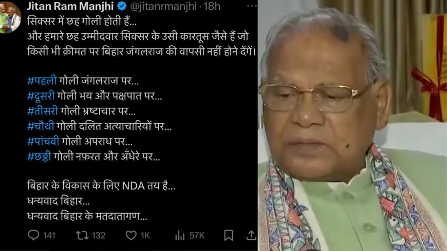 जीतन राम मांझी ने अपने एक्स (X) अकाउंट पर लिखा सिक्सर में छह गोली होती है, और हमारे छह उम्मीदवार सिक्सर के उसी कारतूस जैसे हैं जो किसी भी क़ीमत पर बिहार में जंगलराज की वापसी नहीं होने देंगे।पहली गोली जंगलराज पर, दूसरी भय और पक्षपात पर, तीसरी भ्रष्टाचार पर, चौथी दलित अत्याचारियों पर, पाँचवीं अपराध पर और छठी नफ़रत व अंधेरे पर।बिहार के विकास के लिए एनडीए तय है। धन्यवाद बिहार, धन्यवाद बिहार के मतदाता।
