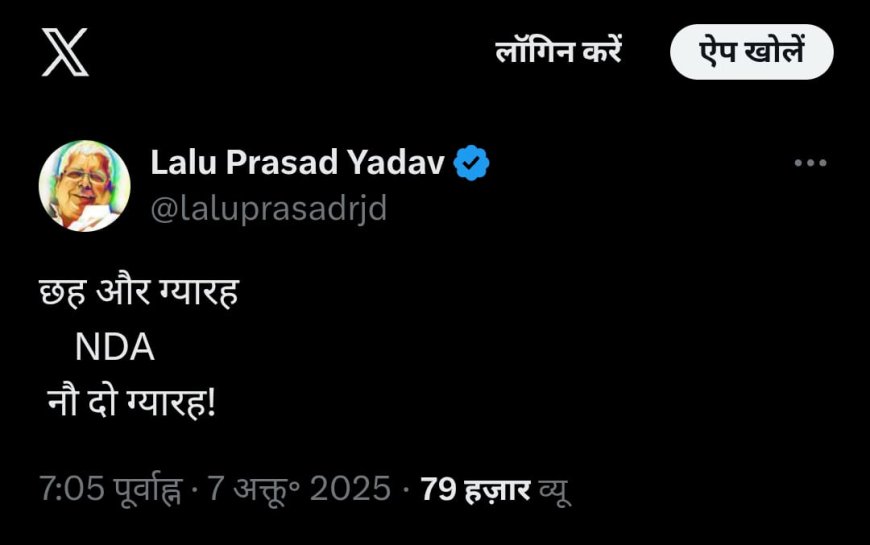 दरअसल, लालू यादव अपने चुटीले व्यंग्य और तंज भरी राजनीति के लिए जाने जाते हैं।जब भी चुनाव आता है, लालू यादव अपने हास्य और करारे बयानबाज़ी के जरिए माहौल गरमा देते हैं।इस बार भी वही हुआ।उनका “6 और 11, NDA नौ दो ग्यारह” वाला पोस्ट बिहार की सियासत में बिजली की तरह फैल गया है।