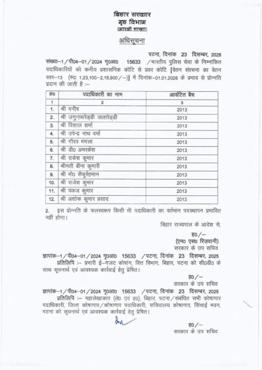 इसके अलावा 2013 बैच के 12 कनीय प्रशासनिक कोटि के आईपीएस अधिकारियों को प्रवर कोटि में पदोन्नत किया गया है।इनमें मनीष, जगुनाथ रेड्डी जलारेड्डी, विशाल शर्मा, उपेन्द्र नाथ वर्मा, गौरव मंगला, डी. अमरकेश, राकेश कुमार, बीना कुमारी, मो. सैफुर्रहमान, राजेश कुमार, पंकज कुमार और अशोक कुमार प्रसाद शामिल हैं।गृह विभाग के इस फैसले से नए साल से पहले बिहार पुलिस को मजबूत और अनुभवी नेतृत्व मिलने जा रहा है। प्रशासनिक हलकों में माना जा रहा है कि इन पदोन्नतियों से राज्य में कानून-व्यवस्था, अपराध नियंत्रण और प्रशासनिक दक्षता को और मजबूती मिलेगी।