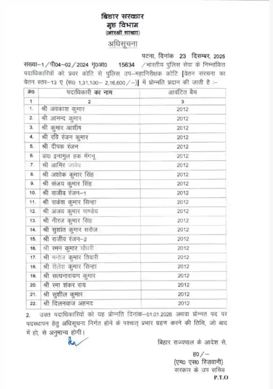 नए वर्ष की शुरुआत से पहले बिहार पुलिस महकमे में व्यापक प्रशासनिक फेरबदल किया गया है। गृह विभाग ने 43 आईपीएस अधिकारियों को पदोन्नति देने का निर्णय लिया है, जिससे राज्य पुलिस प्रशासन के वरिष्ठ और मध्य स्तर पर नेतृत्व की नई संरचना तैयार होगी। इस संबंध में विभाग ने मंगलवार को अधिसूचना जारी कर दी है।अधिसूचना के अनुसार, सभी पदोन्नतियां 1 जनवरी 2026 अथवा उसके बाद..