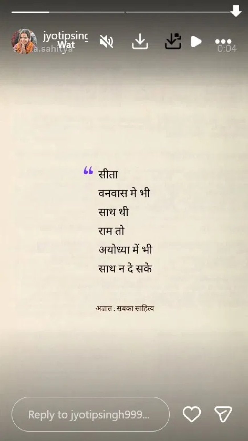 वहीं पति की कथित तीसरी शादी की अफवाहों के बीच, ज्योति सिंह ने गुरुवार को इंस्टाग्राम पर दो पोस्ट शेयर किए।पहले पोस्ट में लिखा था “सीता वनवास में भी साथ थीं, राम अयोध्या में भी साथ न दे सके।”वहीं दूसरे पोस्ट में उन्होंने लिखा “शिव का अपनाया हुआ अक्सर दुनिया से ठुकराया हुआ होता है।”बता दें कि इन पंक्तियों को फैंस ज्योति सिंह की निजी पीड़ा और मौजूदा हालात से जोड़कर देख रहे हैं।