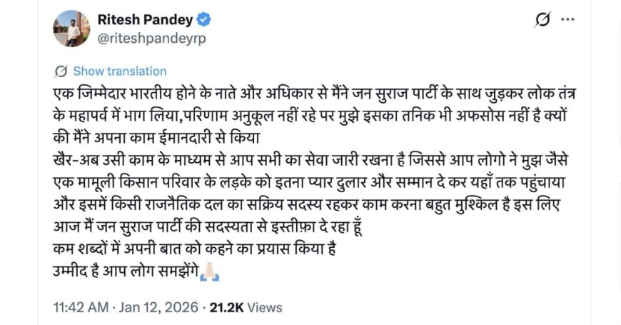 रितेश पांडेय ने जनता के प्रति आभार जताते हुए कहा कि वह एक साधारण किसान परिवार से आते हैं और जनता ने उन्हें जो प्यार, सम्मान और समर्थन दिया, उसी की बदौलत वह इस मुकाम तक पहुंच सके।वहीं अपने फैसले के पीछे की वजह बताते हुए रितेश ने कहा कि किसी राजनीतिक दल के सक्रिय सदस्य के रूप में लगातार काम करना उनके लिए बेहद कठिन साबित हुआ। इसी आत्ममंथन के बाद उन्होंने जनसुराज पार्टी की सदस्यता से इस्तीफा देने का निर्णय लिया। बता दें कि उन्होंने कम शब्दों में अपनी बात रखते हुए उम्मीद जताई कि लोग उनके फैसले को समझेंगे और उसका सम्मान करेंगे।