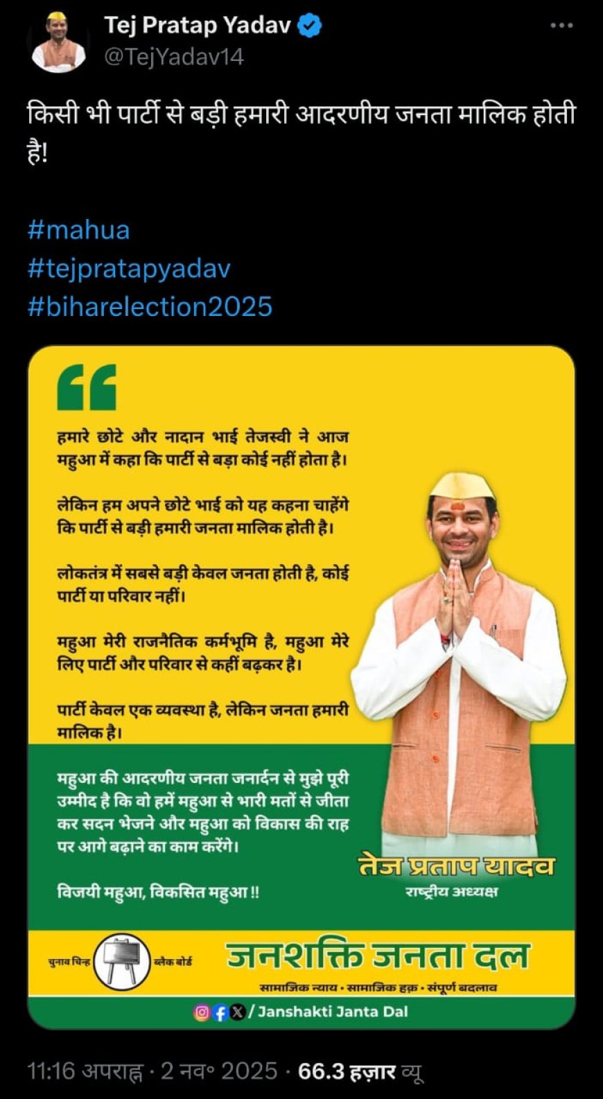 तेजप्रताप यादव ने लिखा है किसी भी पार्टी से बड़ी हमारी आदरणीय जनता मालिक होती है!हमारे छोटे और नादान भाई तेजस्वी ने आज महुआ में कहा कि पार्टी से बड़ा कोई नहीं होता है।लेकिन हम अपने छोटे भाई को यह कहना चाहेंगे कि पार्टी से बड़ी हमारी जनता मालिक होती है।लोकतंत्र में सबसे बड़ी केवल जनता होती है, कोई पार्टी या परिवार नहीं।महुआ मेरी राजनैतिक कर्मभूमि है, महुआ मेरे लिए पार्टी और परिवार से कहीं बढ़कर है।पार्टी केवल एक व्यवस्था है, लेकिन जनता हमारी मालिक है।महुआ की आदरणीय जनता जनार्दन से मुझे पूरी उम्मीद है कि वो हमें महुआ से भारी मतों से जीता कर सदन भेजने और महुआ को विकास की राह पर आगे बढ़ाने का काम करेंगे।