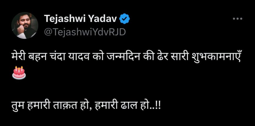बता दें कि इस संदेश में राजनीति की तल्ख़ी नहीं, बल्कि भाई-बहन के रिश्ते की संवेदनशीलता और अपनापन साफ झलकता है। खास बात यह है कि यह पोस्ट ऐसे समय में सामने आई है जब तेजप्रताप यादव खुद राजनीतिक और पारिवारिक चुनौतियों से गुजर रहे हैं। ऐसे में उनका यह इज़हार यह बताता है कि सत्ता और मतभेद अपनी जगह हैं, लेकिन पारिवारिक रिश्ते हर हाल में कायम रहते हैं।बता दें कि तेजप्रताप के साथ साथ तेजस्वी यादव ने भी बहन चंदा यादव को जन्मदिन की बधाई दी है।