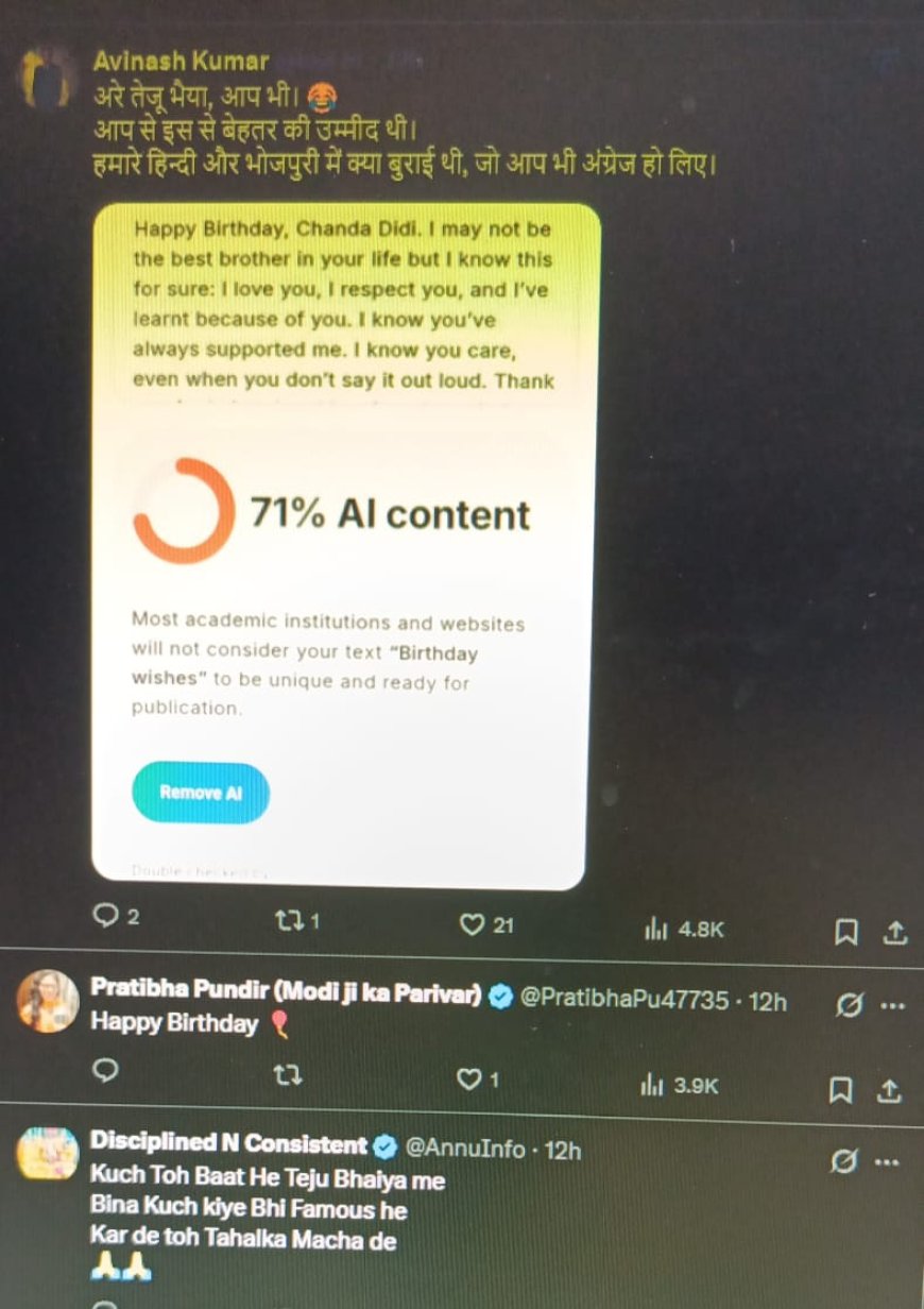 वहीं कुछ यूजर्स ने तो यहां तक तंज कस दिया कि यह पोस्ट कहीं कॉपी-पेस्ट या AI की मदद से तो नहीं लिखी गई।बता दें कि भले ही यह पोस्ट निजी और भावनात्मक थी, लेकिन उसकी अंग्रेज़ी भाषा और अंदाज़ ने इसे सोशल मीडिया पर चर्चा का विषय बना दिया। एक बार फिर तेजप्रताप यादव ने यह साबित कर दिया कि वे बिना किसी बड़े राजनीतिक बयान के भी सुर्खियों में आ सकते हैं।