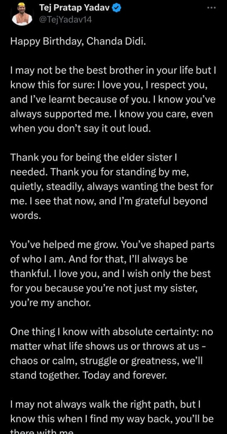 तेजप्रताप ने लिखा,हैप्पी बर्थडे, चंदा दीदी... हो सकता है कि मैं आपकी ज़िंदगी का सबसे अच्छा भाई न रहा हूं, लेकिन मैं यह निश्चित रूप से जानता हूं कि मैं आपसे प्यार करता हूं, आपका सम्मान करता हूं और मैं आपकी वजह से ही सीख पाया हूं। मैं जानता हूं कि आपने मुझे हमेशा सपोर्ट किया है। मैं जानता हूं कि आप केयर करती हैं, जबकि आप इसे कहती भी नहीं हैं।उन्होंने अपनी बहन को अपना “एंकर” बताते हुए कहा कि जीवन चाहे संघर्ष लाए या शांति, वे हमेशा एक-दूसरे के साथ खड़े रहेंगे। पोस्ट में तेजप्रताप ने चंदा यादव के निस्वार्थ समर्थन, चुपचाप देखभाल करने की आदत और उनके जीवन पर पड़े सकारात्मक प्रभाव के लिए आभार भी जताया।