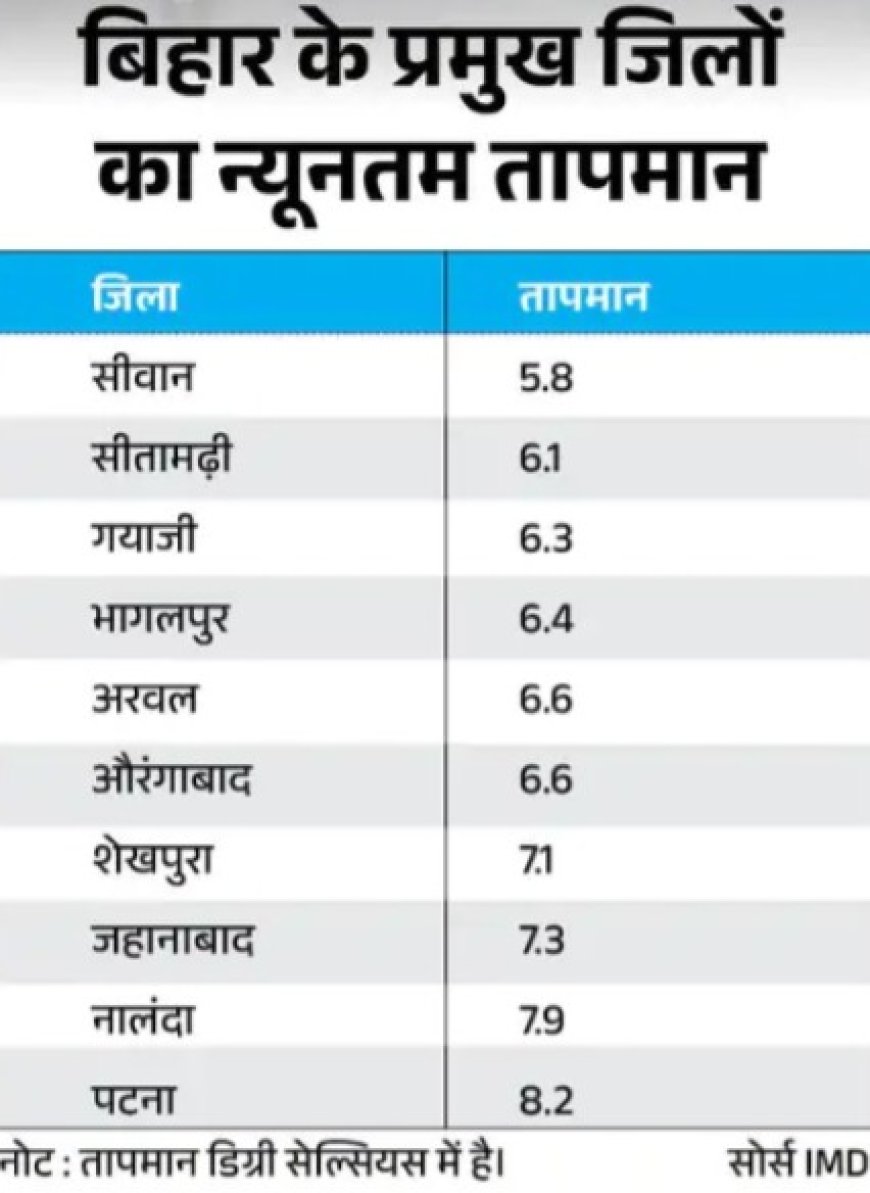 आईएमडी के अनुसार गुरुवार को छपरा और मधुबनी में भीषण कोल्ड डे दर्ज किया गया, जबकि भागलपुर, मुजफ्फरपुर और समस्तीपुर में कोल्ड डे की स्थिति रही।राज्य में सबसे कम न्यूनतम तापमान 5.8 डिग्री सेल्सियस सीवान के जीरादेई में रिकॉर्ड किया गया। पूरे बिहार में न्यूनतम तापमान 5.8 से 10 डिग्री सेल्सियस के बीच रहा।वहीं सबसे अधिक अधिकतम तापमान 24.2 डिग्री सेल्सियस किशनगंज में दर्ज किया गया। गुरुवार को सबसे कम दृश्यता (विजिबिलिटी) 20 मीटर भागलपुर में रही। बिहार में ठंड और कोहरे का असर अभी कुछ दिन और बना रहेगा। खासकर उत्तर बिहार के लोगों को सतर्क रहने की जरूरत है, जबकि दक्षिण बिहार में दिन के समय हल्की राहत मिल सकती है।