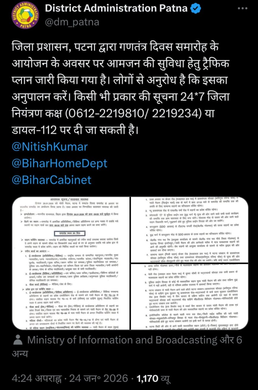 26 जनवरी को गणतंत्र दिवस के अवसर पर डाकबंगला चौराहा से गांधी मैदान यानी चिल्ड्रन पार्क तक सामान्य वाहनों का इंट्री पूरी तरह बंद रहेगा। न्यू डाकबंगला रोड से एसपी वर्मा रोड की ओर जाने पर भी रोक रहेगी। बुद्ध मार्ग में कोतवाली टी से पुलिस लाइन तक पूर्व दिशा में जाने वाले रास्ते बंद रहेंगे।वाहन वोल्टास मोड़ से विद्यापति मार्ग होते हुए पुलिस लाइन तिराहा की ओर जा सकेंगे। छज्जूबाग में एसडीओ आवास से जेपी गोलंबर की ओर और बुद्ध मार्ग में छज्जूबाग मोड़ से एसडीओ आवास की ओर भी आना-जाना नहीं होगा।